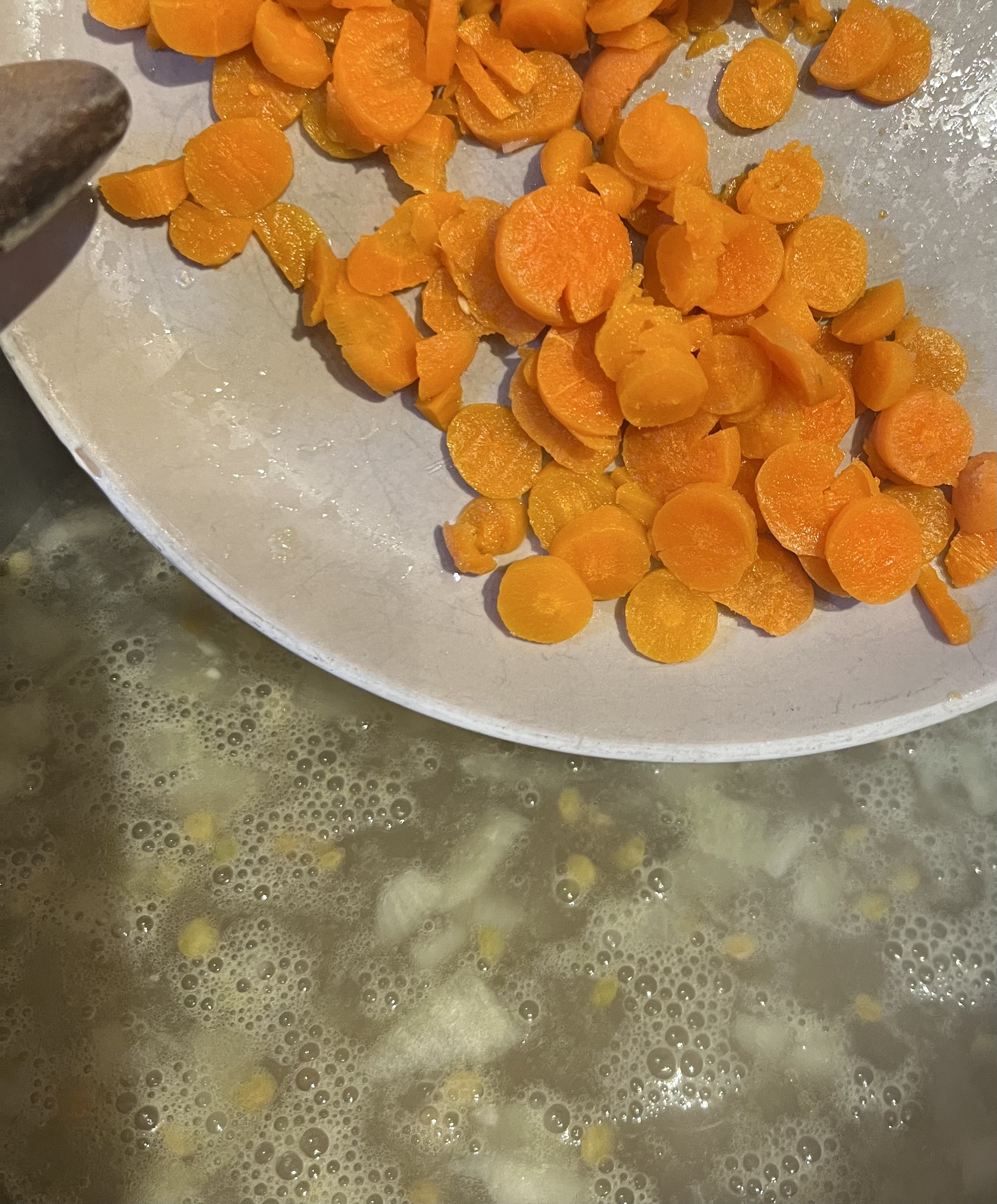 Once brought to a boil, reduce to medium heat, and add the carrots bay leaves and salt to taste. Partially cover the stockpot and leave it to boil thoroughly for roughly 45 minutes or until the lentils are soft.
